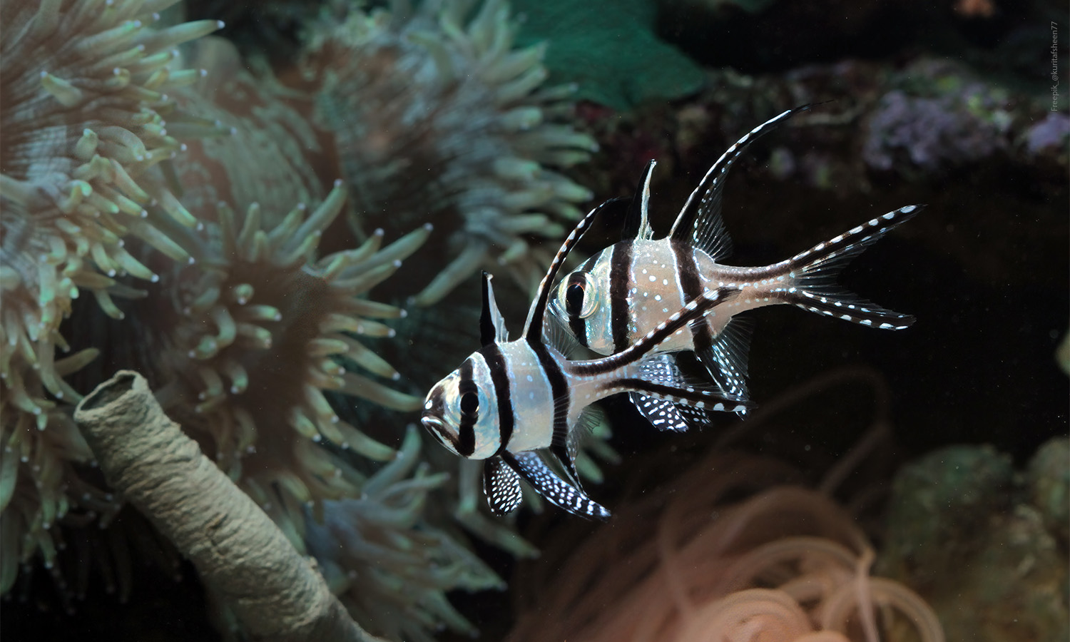 Bangaii Cardinalfish (Pterapogon kaudern), are a popular species of small marine fish that are native to Indonesia. These fish are known for their striking appearance, which makes them a popular addition to aquariums around the world.