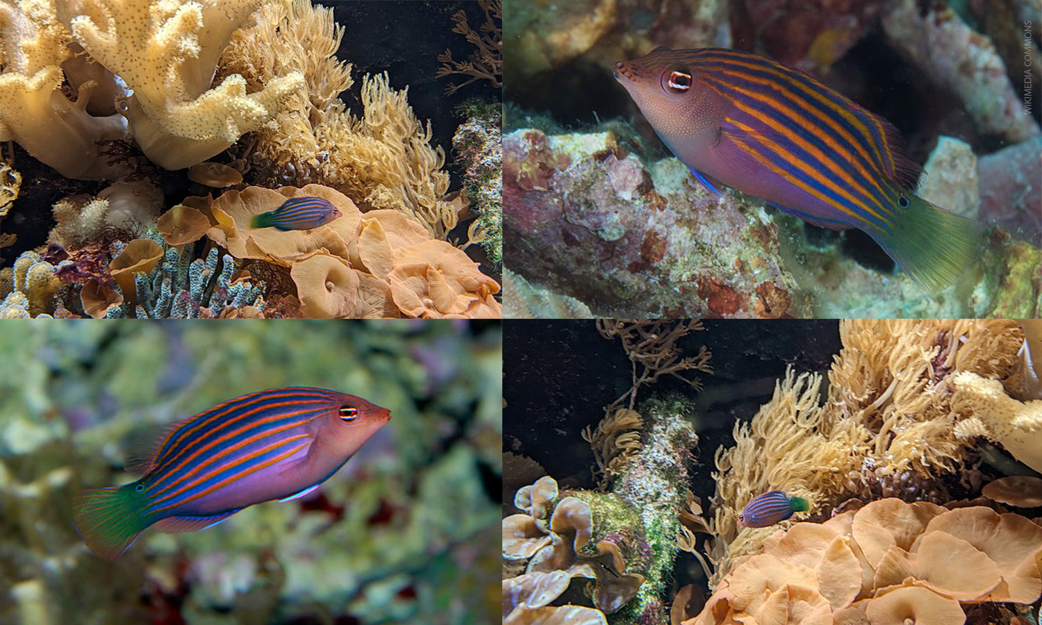 This is are relatively small fish, typically growing up to a maximum of 4 inches in length. It has a slender body with six distinct stripes running horizontally along its body, hence its name. These stripes are usually purple or blue in color and are separated by a orangey-yellow background. The tail fin can be green at the base and transition into yellow or become transparent.